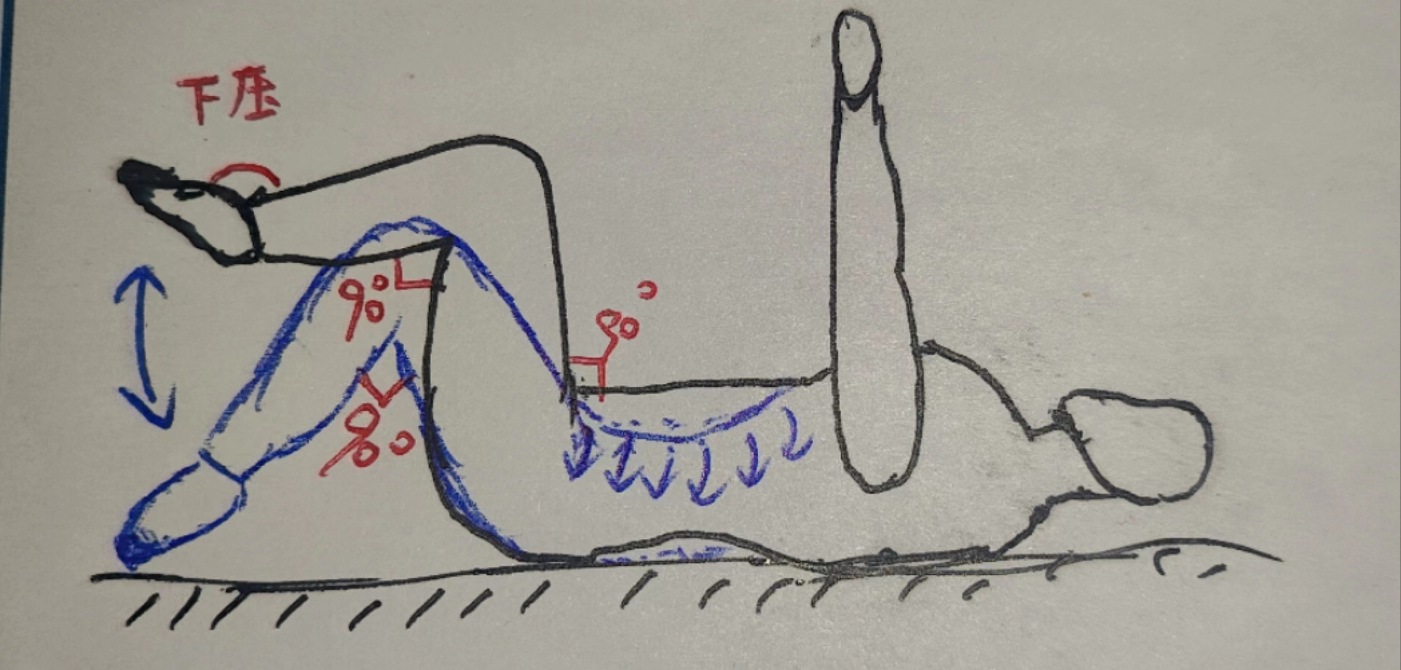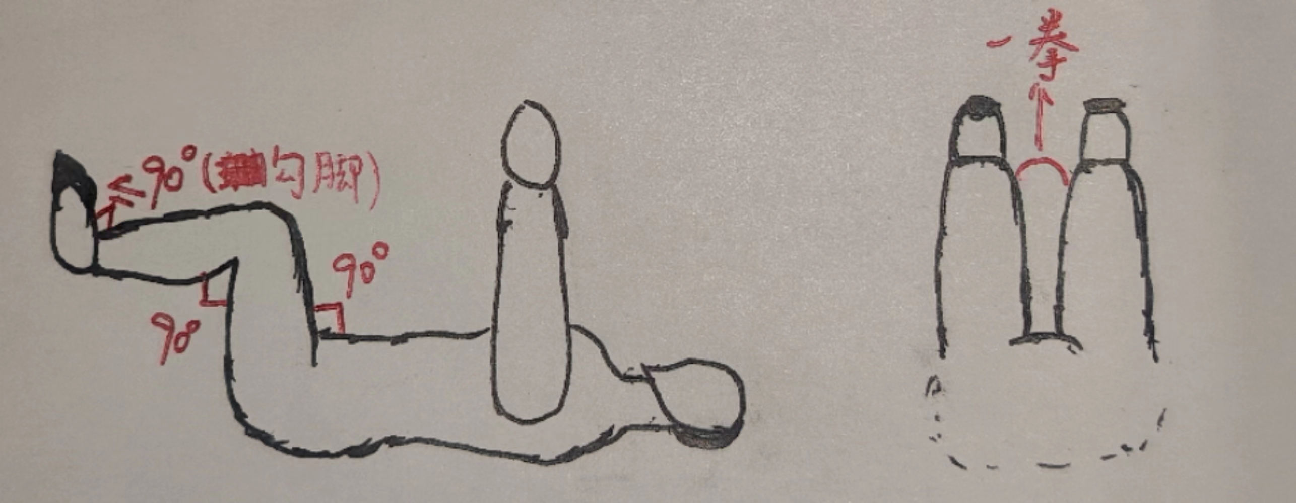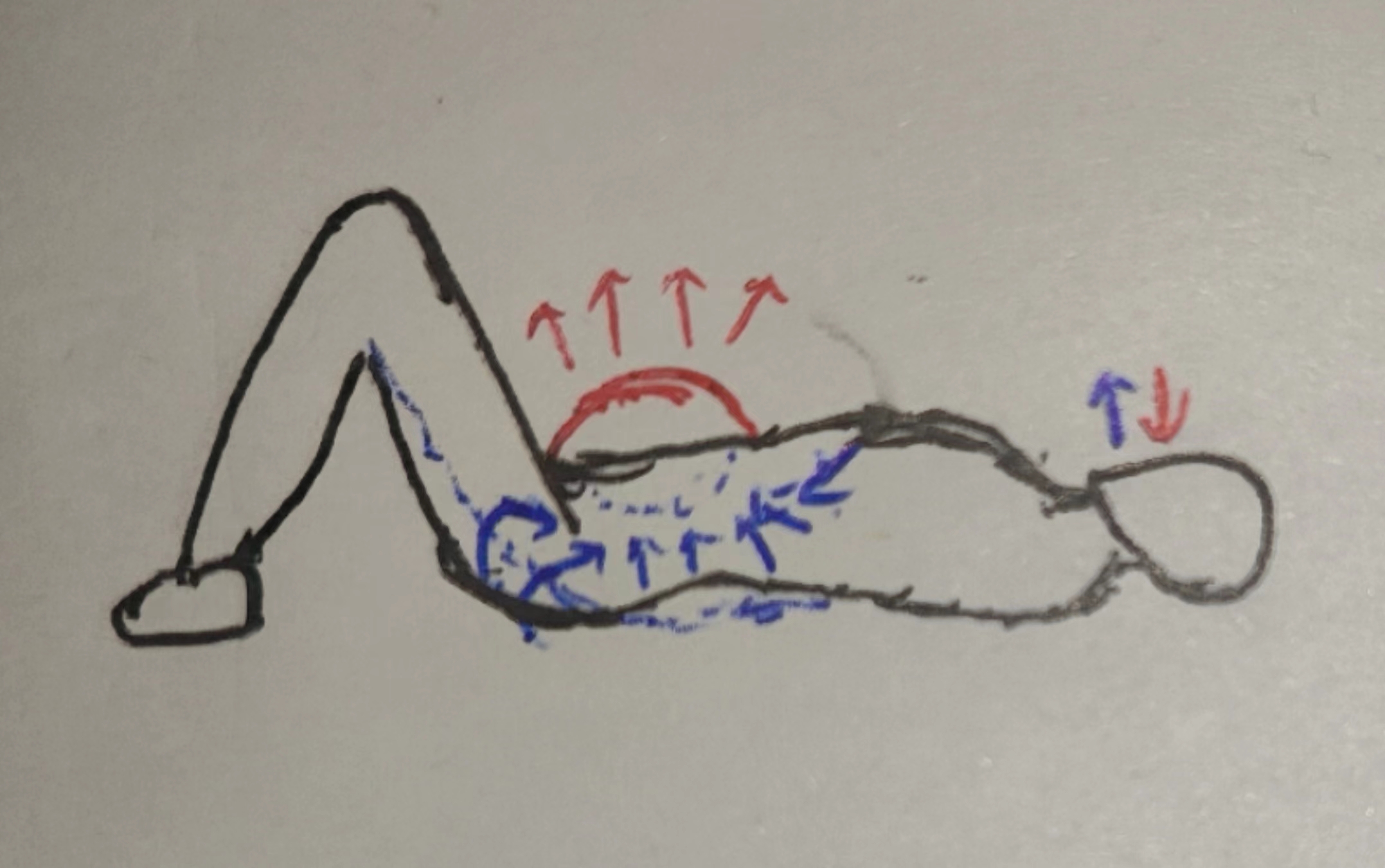 准备动作:训练者以如图所示的姿势平躺在地面上。注意髋角,膝角均为90°,勾脚尖,两腿之间的间隔为一拳距离,脊柱保持中立位,略微下沉肩胛骨,全身放松,注意收下巴确保颈椎也处于中立位。这种动作可以对着镜子,或者录像,或者找一个辅助者来进行规范。