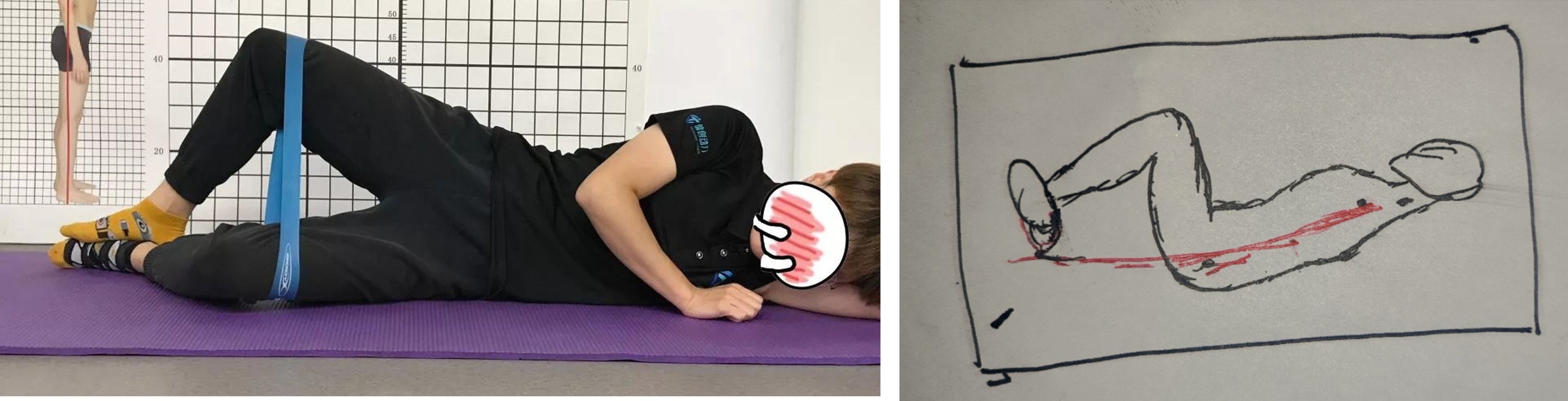 准备动作:如图所示侧躺。勾脚尖,脚后跟,臀部,颈椎呈三点一线。保持脊柱中立位,收下巴。弹力带可有可无。可让辅助者帮你调整动作。
